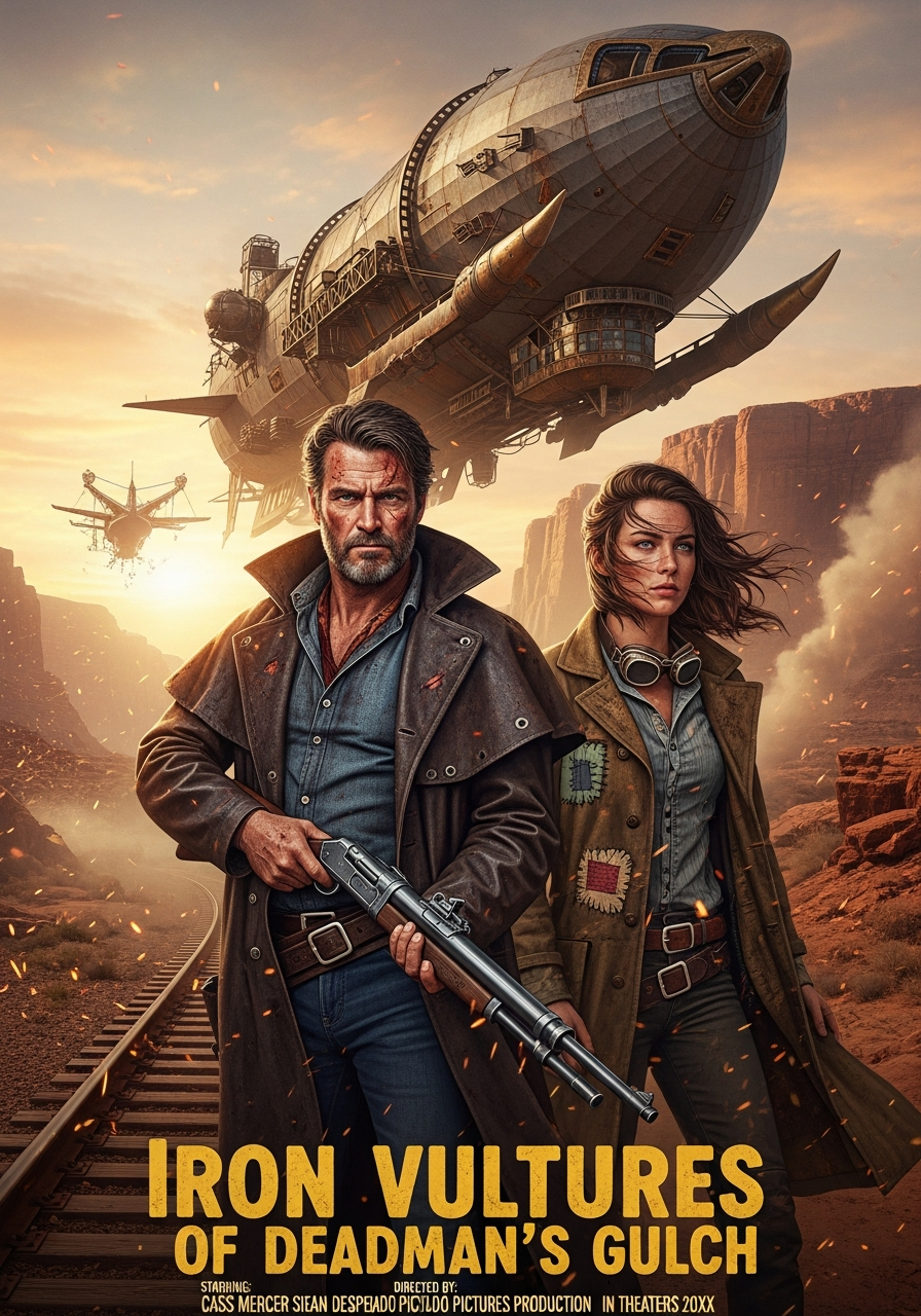 In the dying days of the frontier, Cass Mercer, a former railway enforcer framed for torching a supply line, hides out in the lawless mining settlement of Deadman’s Gulch. When a colossal ironclad airship—The Vulture—descends on the canyon, its mercenary captain demands control of the last operating rail junction, threatening to starve the territory into surrender.