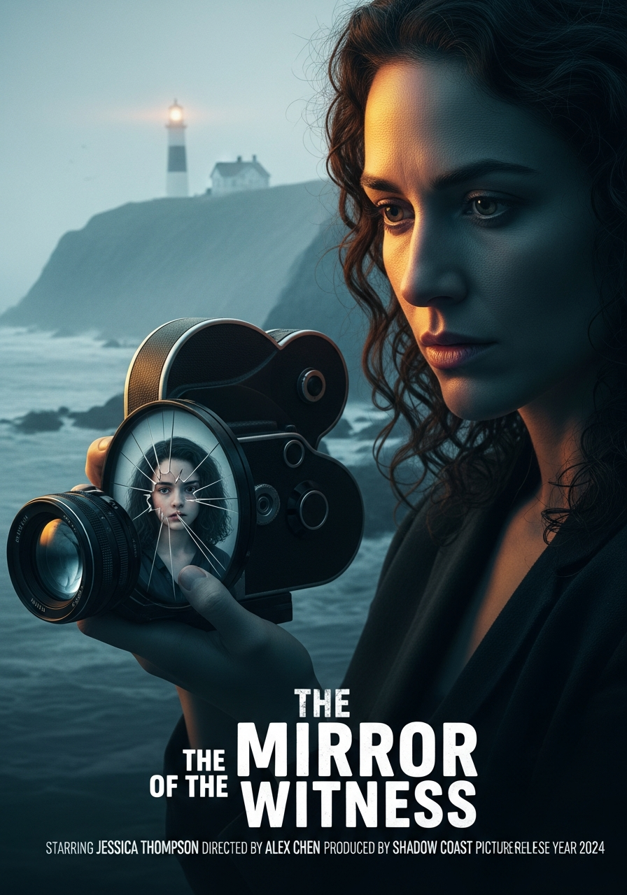 A moody, psychological-thriller poster set on a foggy coastal cliffside. Foreground: Mara, a woman in her mid-thirties with dark curly hair, intense eyes, holding a vintage documentary camera pointed slightly downward. Her reflection in a fractured glass lens shows her younger self—a teenage girl she doesn’t recognize. Background: a lonely lighthouse, dimly lit, partially obscured by coastal mist. Color palette: desaturated blues and gray-green tones, with a subtle warm spotlight on Mara’s face. Lighting: soft, eerie, oceanic gloom. Mood: unsettling, introspective. Style: hyper-realistic cinematic photography with psychological tension.